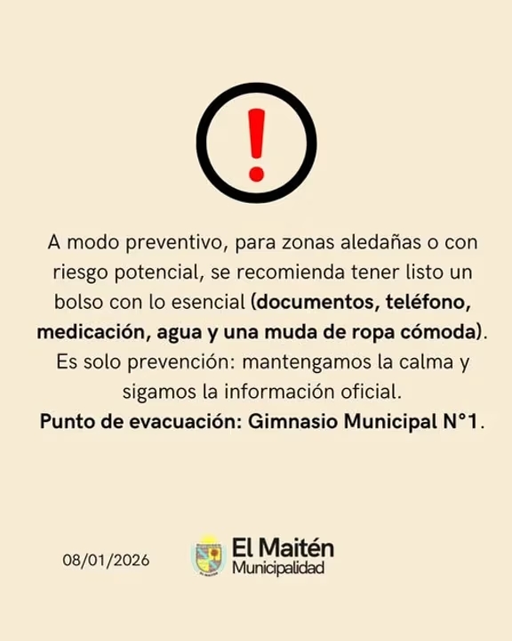 La Municipalidad de El Maitén emitió un aviso preventivo ante la situación de incendios activos en la región cordillerana, recomendando a vecinos y visitantes prepararse ante una posible evacuación sin que esta sea obligatoria, y seguir únicamente la información oficial.