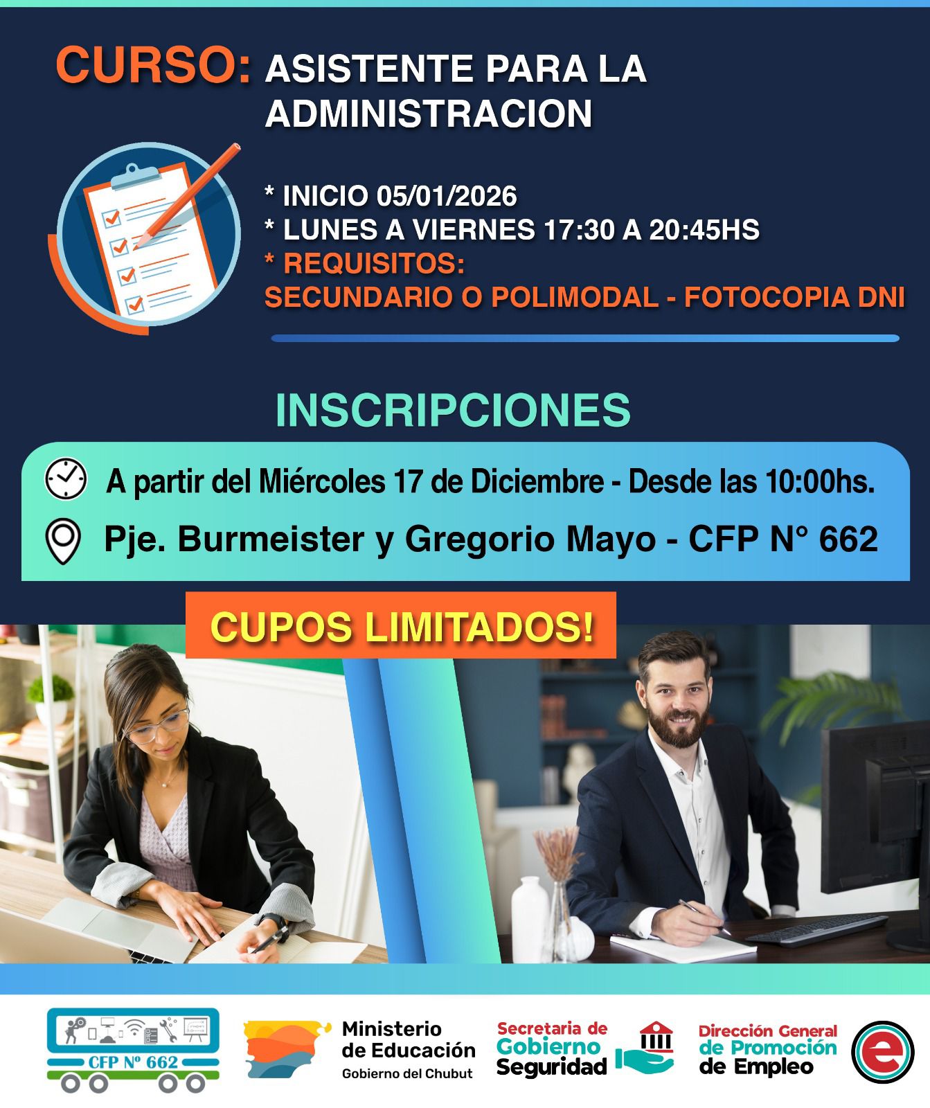 La Dirección General de Promoción de Empleo de la Municipalidad de Rawson, en colaboración con el Ministerio de Educación y el Centro de Formación Profesional N° 662, informa que siguen abiertas las inscripciones para el curso gratuito «Asistente para la Administración», que se dictará de lunes a viernes, de 17:30 a 20:45 horas, comenzando este 5 de enero de 2026.