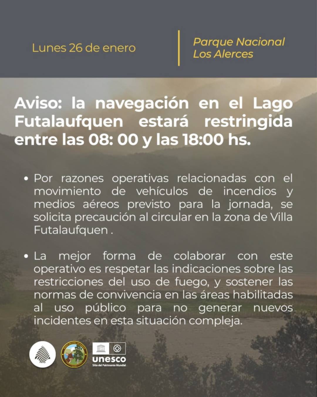 El Parque Nacional Los Alerces informó que este lunes 26 de enero se aplicarán restricciones temporales en la navegación del Lago Futalaufquen, en el marco del operativo de combate de incendios que se desarrolla en la zona cordillerana.