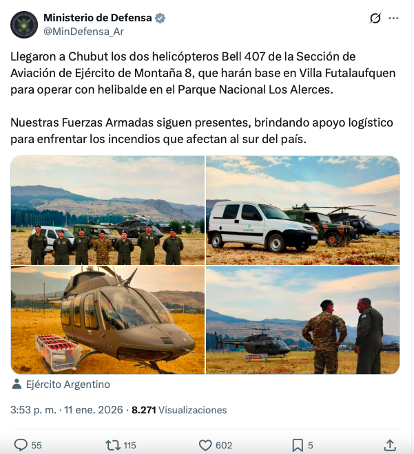 Según Ministerio de Defensa, las aeronaves harán base en Villa Futalaufquen y operarán con helibalde, una herramienta clave para transportar y descargar grandes volúmenes de agua sobre las zonas afectadas. La presencia de estos equipos especializados busca fortalecer la capacidad de respuesta frente a los incendios que se expanden en distintos sectores del sur del país.