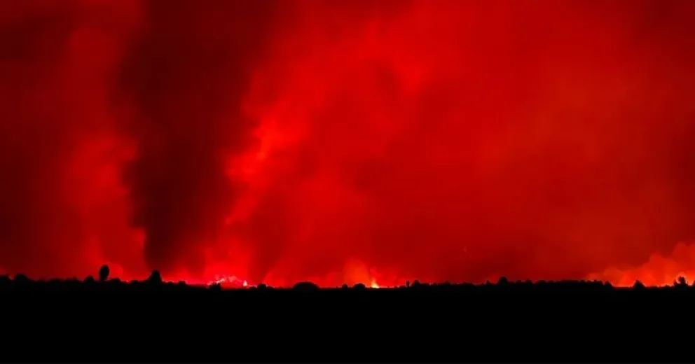 El resplandor de las llamas fue visible desde distintos puntos de la localidad, tiñendo el cielo de un rojo intenso durante gran parte de la noche. La combinación de viento fuerte y vegetación extremadamente seca favoreció un comportamiento errático del fuego, que avanzó desde diferentes sectores en simultáneo.