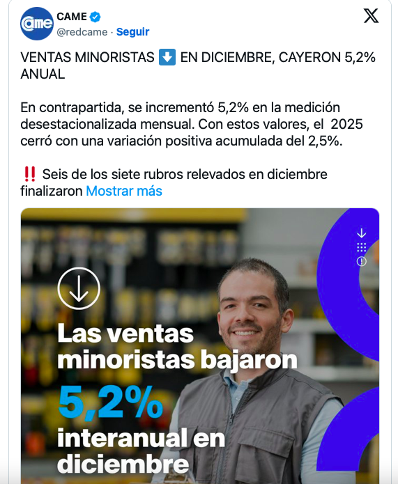 Desde CAME señalaron que diciembre funcionó como un alivio financiero por las fiestas y el cobro de aguinaldos, aunque aclararon que no logró revertir la caída estructural del consumo. Además, advirtieron que las familias mantuvieron un gasto racional y focalizado en productos esenciales.