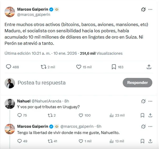 Galperin, que reside en el país vecino desde hace años —salvo por un breve período durante la gestión de Mauricio Macri—, respondió de manera escueta: “Tengo la libertad de vivir donde más me guste, Nahuelito”. Ante la insistencia del usuario, que le señaló que “Uruguay te gusta más que tu país”, el empresario decidió no contestar más.