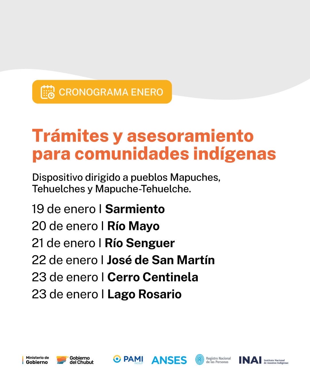 El Gobierno del Chubut, a través del Ministerio de Gobierno, llevará adelante un Operativo Territorial de Asesoramiento a Comunidades Indígenas con el objetivo de acercar servicios, brindar acompañamiento institucional y garantizar el acceso a derechos en distintas localidades y parajes del sur provincial.