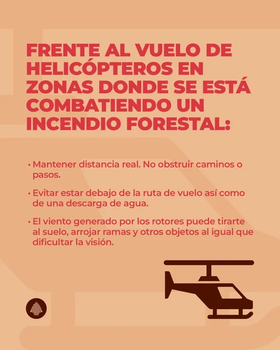 La operatividad de los helicópteros implica riesgos específicos que muchas veces son desconocidos por el público general. Según EQS Notas, es fundamental mantener una distancia real de las áreas de trabajo y evitar la obstrucción de caminos o senderos internos. Estos pasos son utilizados de forma ininterrumpida por brigadistas y vehículos de emergencia, por lo que cualquier interferencia externa puede retrasar la respuesta ante el avance de las llamas o poner en peligro la logística del comando unificado.