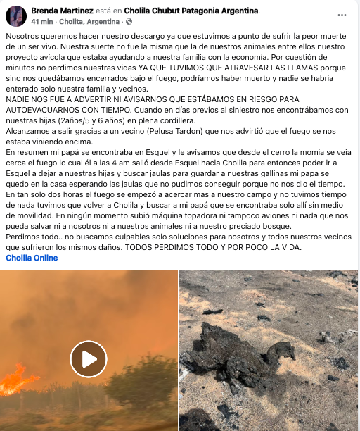 Relataron que, mientras intentaban conseguir jaulas para poner a salvo a sus animales, el fuego avanzó con una velocidad tal que apenas les permitió rescatar al padre de la familia, quien se encontraba solo y sin movilidad en el campo. «En ningún momento subió una máquina topadora ni aviones que pudieran salvarnos a nosotros o a nuestros animales», expresaron con dolor ante la pérdida del bosque y su capital de trabajo.