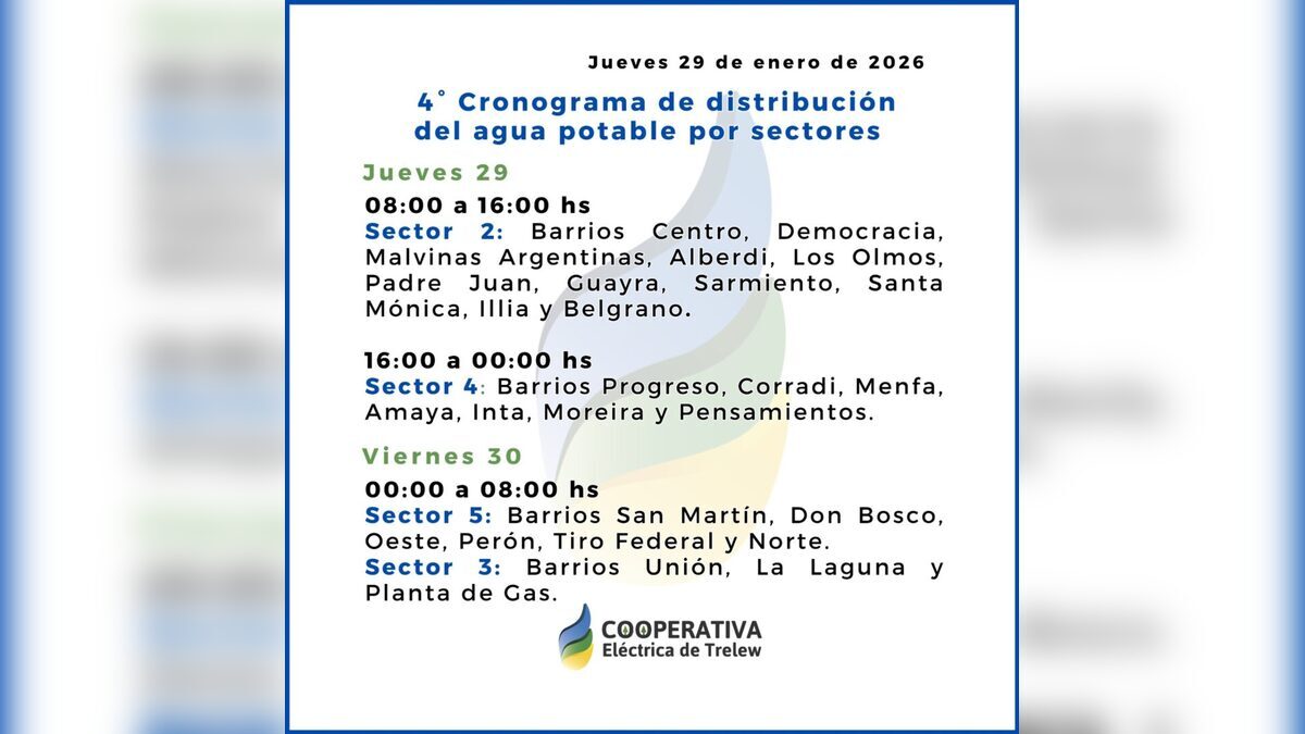 Para este 29 de enero, la distribución se organizó en turnos de ocho horas. Durante la madrugada y primeras horas de la mañana, el suministro fue asignado a los Sectores 3 y 5, que abarcan barrios como San Martín, Don Bosco, Tiro Federal y Norte, entre otros.