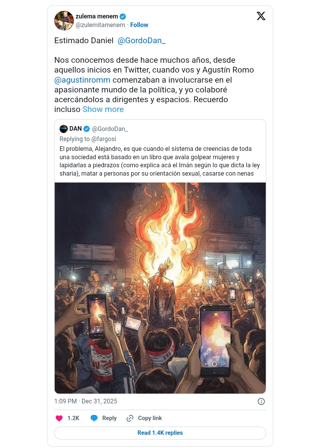 En la víspera de Año Nuevo, una nueva interna política se abrió en la Casa Rosada. El enfrentamiento se dio entre los tuiteros libertarios cercanos al asesor presidencial Santiago Caputo y los herederos del legado de Carlos Menem. El detonante fue un mensaje de Daniel Parisini, conocido como Gordo Dan, quien vinculó al Islam con el terrorismo, la pedofilia y los femicidios. La respuesta llegó de la mano de Zulemita Menem, que defendió la fe musulmana y reclamó respeto hacia la comunidad.