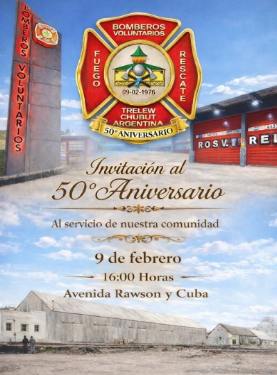 El cuartel de Bomberos Voluntarios de Trelew celebrará este lunes su 50° aniversario de servicio a la comunidad con un acto institucional que se desarrollará a partir de las 16:00 horas en la sede central ubicada en la intersección de avenida Rawson y Cuba.