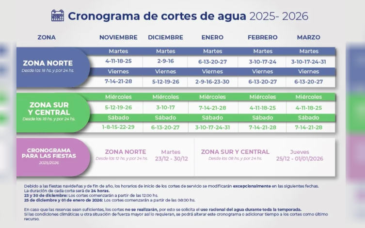 Para los vecinos de la Zona Sur y Central, el cronograma habitual se mantiene los días miércoles y sábados, comenzando también a las 18:00 horas y con una duración de un día completo. Las autoridades de la Sociedad Cooperativa Popular Limitada (SCPL) confirmaron que seguirán monitoreando los niveles hora a hora para determinar si son necesarias nuevas modificaciones en los días venideros.