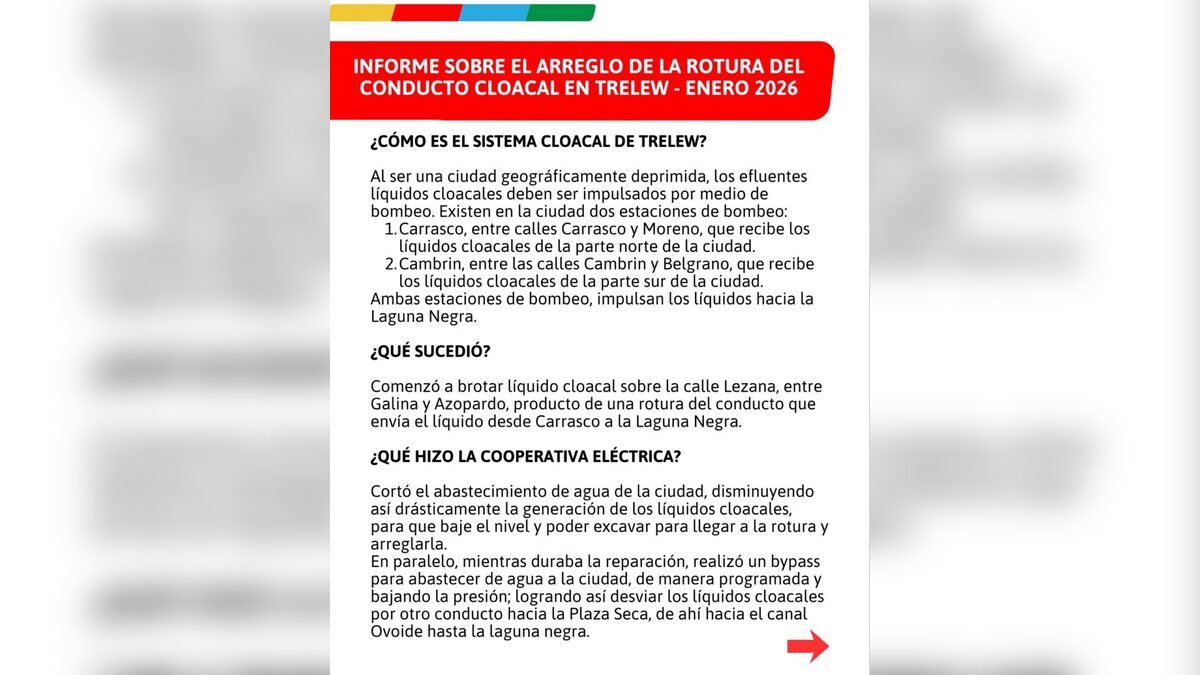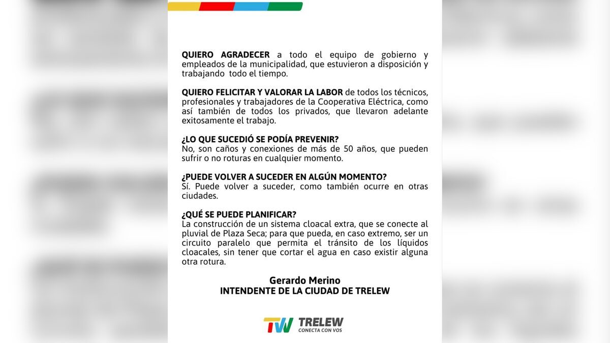 Finalmente, el jefe comunal hizo mención al comportamiento de los distintos sectores políticos durante la crisis. Lamentó que en situaciones de emergencia se intente buscar rédito partidario, cuando la prioridad absoluta debe ser la asistencia a la comunidad. Con el servicio en vías de normalización, el informe de Merino deja abierta la puerta a un debate necesario sobre la inversión en obras de infraestructura básica para Trelew, entendiendo que el parche sobre lo obsoleto ya no garantiza la seguridad sanitaria de los contribuyentes.