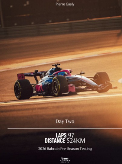 En el posteo, el equipo al que pertenece el argentino Franco Colapinto publicó los siguientes datos: tras el segundo día de test de pretemporada en Bahréin, Gasly completó 97 vueltas, recorriendo una distancia de 524 kilómetros.