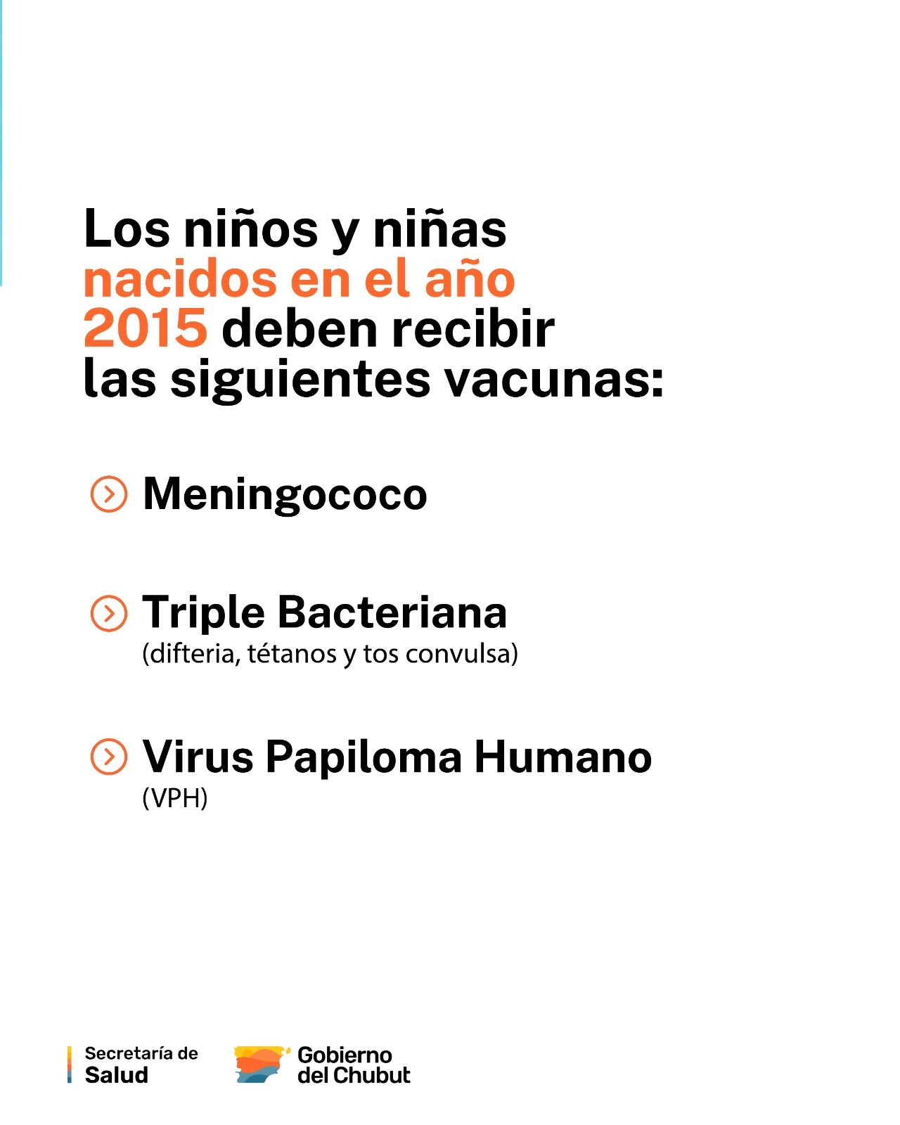 Por su parte, los nacidos en 2015 deben recibir la vacuna Triple Bacteriana Acelular, que previene la Difteria, el Tétanos y la Tos Convulsa; la vacuna contra el Virus del Papiloma Humano (VPH), que previene el cáncer de cuello uterino en las niñas y otros cánceres relacionados al VPH tanto en mujeres como en hombres, y cuyo esquema se modificó y paso a ser de una sola dosis; y, finalmente, una dosis de la vacuna contra el Meningococo.