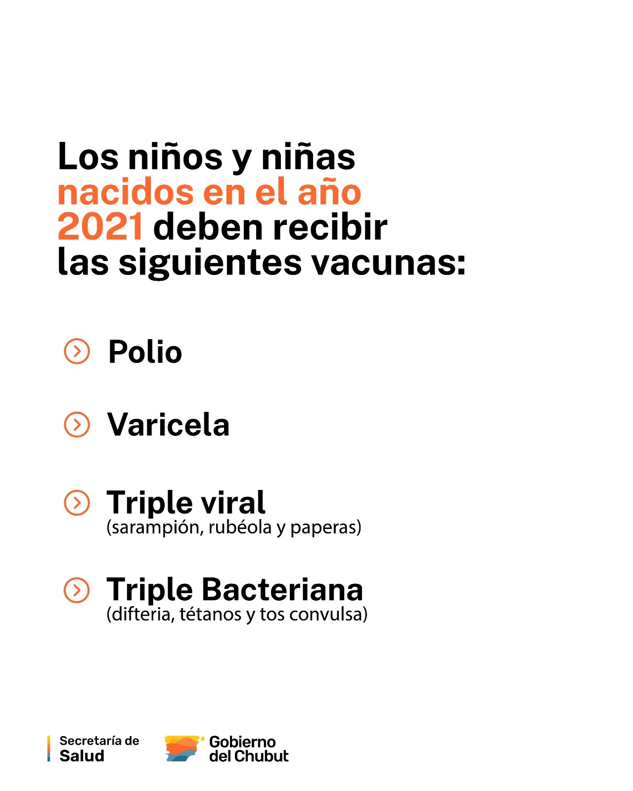 Por otro lado, desde la cartera sanitaria provincial se recordó que las vacunas que deben recibir las niñas y los niños nacidos en 2021 son las siguientes: la vacuna Triple Viral, que previene el Sarampión, la Rubéola y las Paperas; la vacuna Triple Bacteriana Celular, que previene la Difteria, el Tétanos y la Tos Convulsa; el refuerzo de la vacuna Salk, que previene la Poliomielitis; y la segunda dosis de la vacuna contra la Varicela.