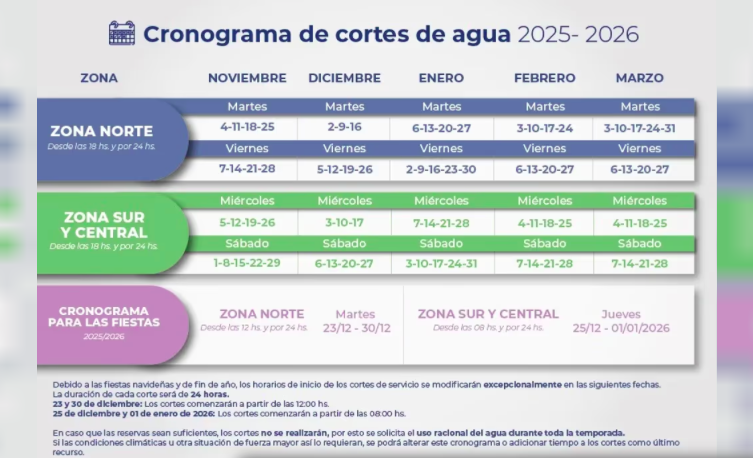 La interrupción en la zona norte comenzará este viernes 13 de febrero a partir de las 18:00 horas y se extenderá por un lapso de 24 horas. Según ADNSUR, el esquema continuará el sábado 14 de febrero, momento en que el corte se trasladará a la zona sur y central de la ciudad, también desde las 18:00 horas y por el mismo periodo de tiempo. Este cronograma sistemático, que se aplica los martes y viernes para el norte, y miércoles y sábados para el sur y centro, es la herramienta técnica para sostener el servicio durante la temporada de mayor demanda.