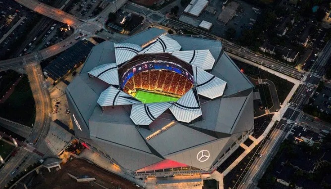 En Atlanta se encuentra el Mercedes-Benz Stadium, cuya construcción también alcanzó los 1.600 millones de dólares. Tiene capacidad para 71.000 personas y se distingue por su techo retráctil con forma de diafragma, capaz de abrirse o cerrarse en pocos minutos.