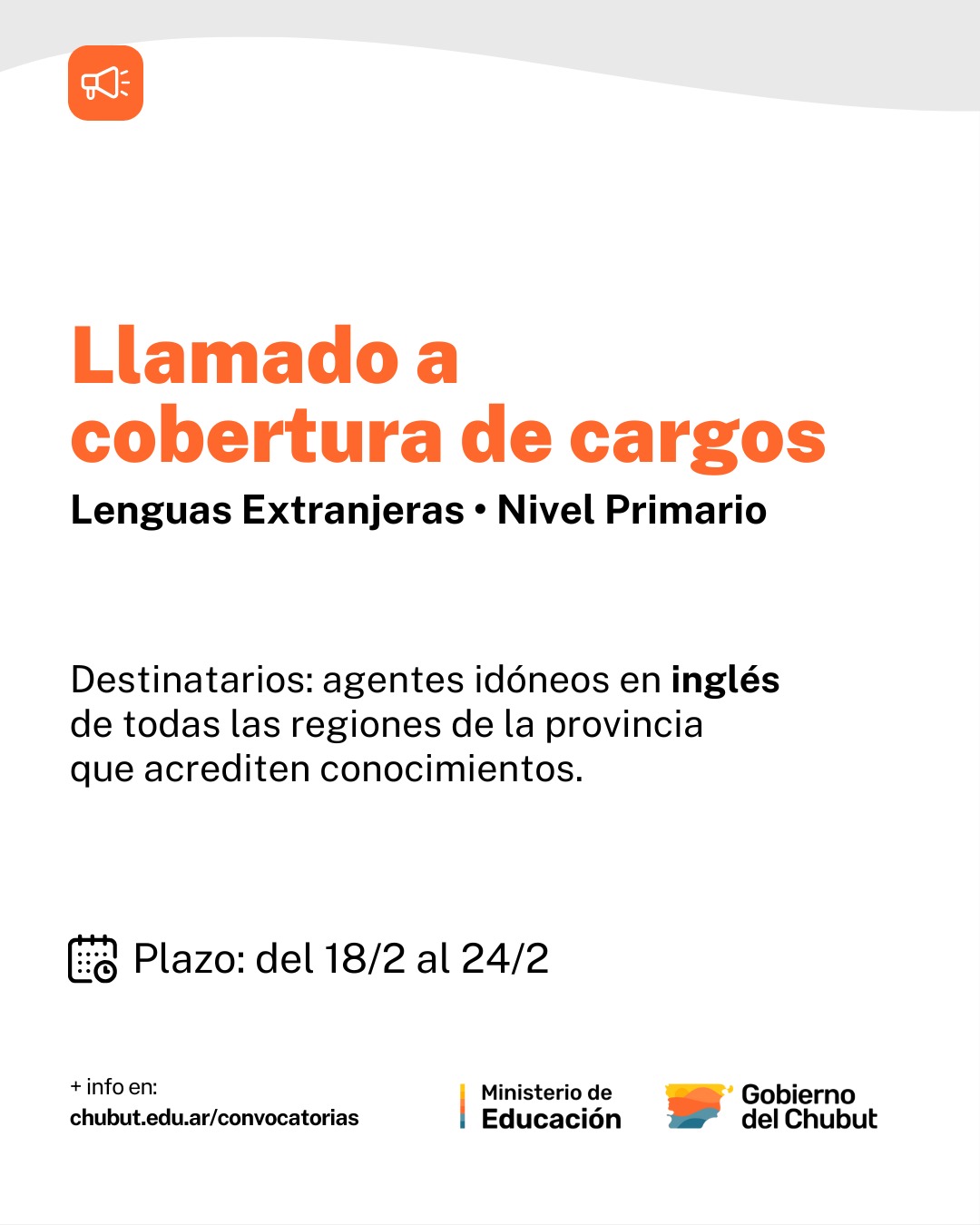 El Gobierno del Chubut, a través del Ministerio de Educación del Chubut, informa la apertura de la convocatoria destinada a la cobertura de interinatos y suplencias a término en el área de Inglés, para el nivel primario de gestión estatal en todas las regiones de la provincia, en el marco del Ciclo Lectivo 2026.