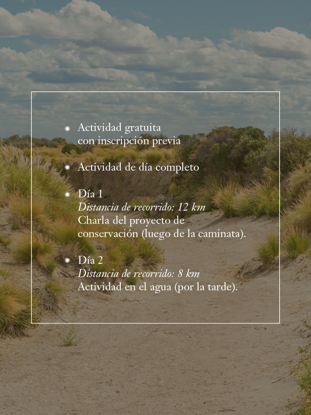 «Se saldrá a caminar con un recorrido de doce kilómetros y, al volver al centro de interpretación, el equipo de Conservación dará una charla», detalló la coordinadora, sumando así un componente educativo clave para entender los trabajos de restauración ecológica que se realizan en la zona.