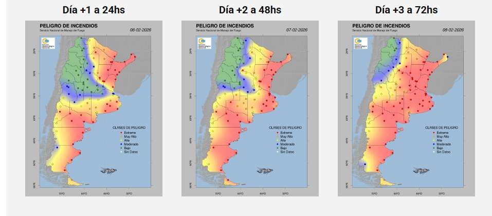 - Viernes 6 de febrero: El peligro se desplaza con mayor intensidad hacia el sur, cubriendo gran parte de la Patagonia central con niveles Extremos.