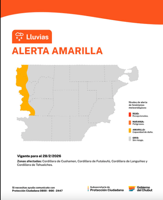 El clima en la región patagónica presentará complicaciones durante la jornada de este sábado. El Servicio Meteorológico Nacional (SMN) ha emitido una alerta de nivel amarillo ante la llegada de un frente de mal tiempo que afectará principalmente al sector cordillerano de la provincia de Chubut. Se espera que las condiciones climáticas adversas se concentren durante la mañana y el mediodía, generando posibles complicaciones en el desarrollo de las actividades habituales y en la transitabilidad de las rutas de la zona.