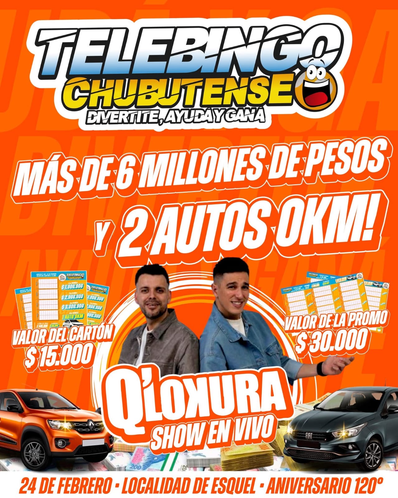 En el marco de los festejos por el 120° aniversario de la ciudad de Esquel, el Gobierno del Chubut, a través del Instituto de Asistencia Social (IAS) – Lotería del Chubut, realizará este martes 24 de febrero una nueva edición del Telebingo Chubutense en el Estadio Municipal de Esquel, con importantes premios y el show en vivo de Q’Lokura, la banda cuartetera del momento.
