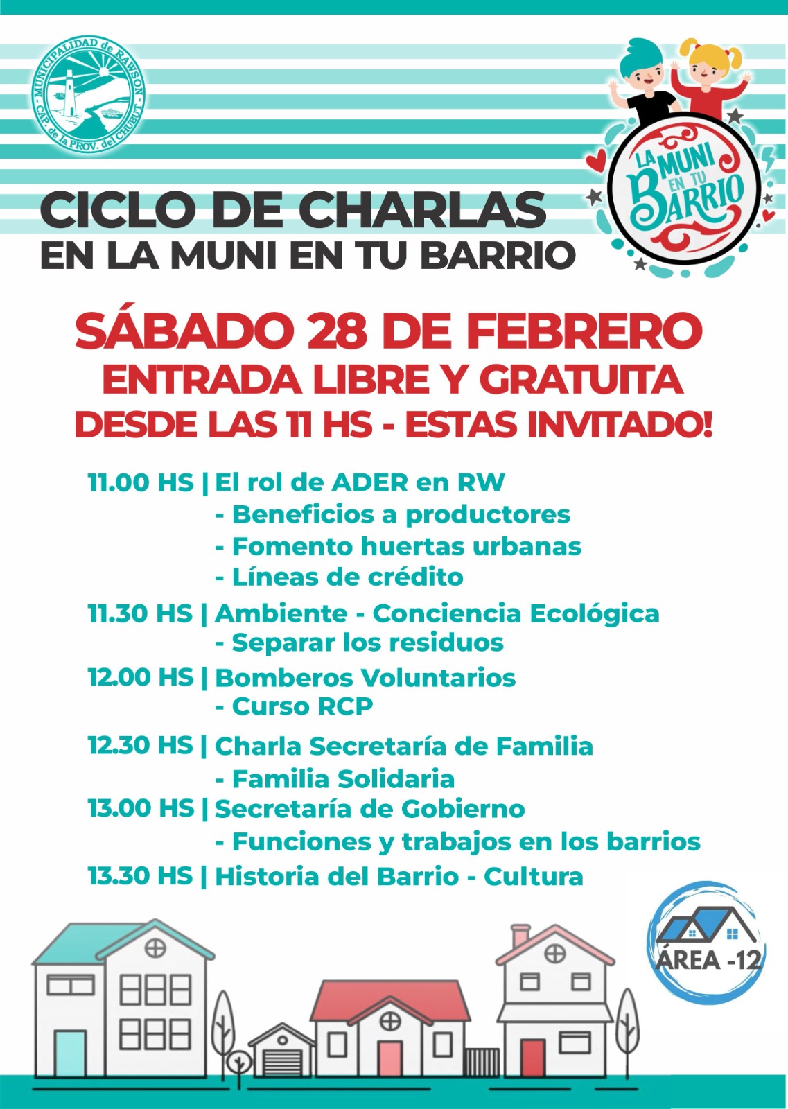La Municipalidad de Rawson llevará adelante este 28 de febrero, desde las 11 horas, en el Centro Comunitario del Área 12, una nueva edición de “La Muni en tu Barrio”, articulando charlas abiertas y servicios municipales, con entrada libre y gratuita, destinada a fortalecer el vínculo con los vecinos y acercar información sobre programas del Municipio.