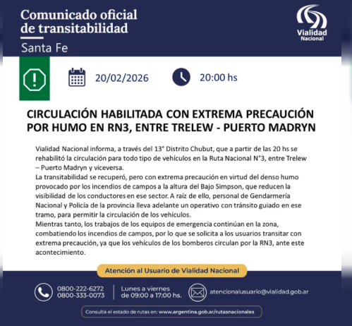 Luego de una tarde de máxima tensión en el Valle Inferior del Río Chubut, las autoridades de Vialidad Nacional informaron que la circulación por la Ruta Nacional N° 3, en el tramo que une Puerto Madryn con Trelew, ha sido rehabilitada. No obstante, el organismo advirtió que los automovilistas deben transitar con «extrema precaución» debido a la persistencia de columnas de humo que afectan la visibilidad en la zona del Bajo Simpson.