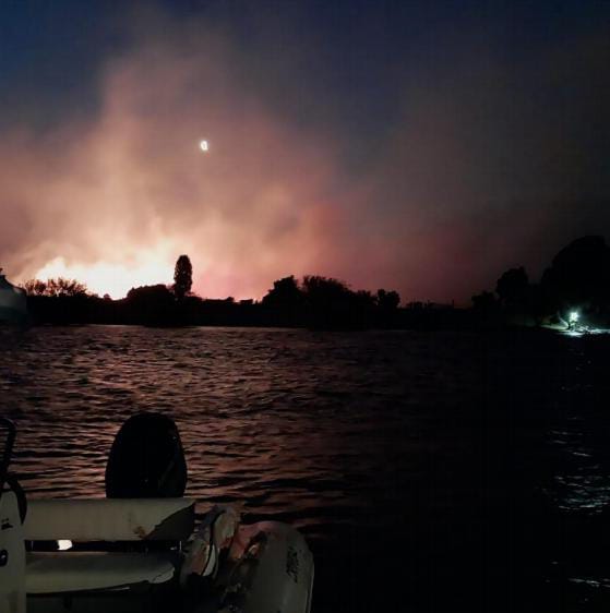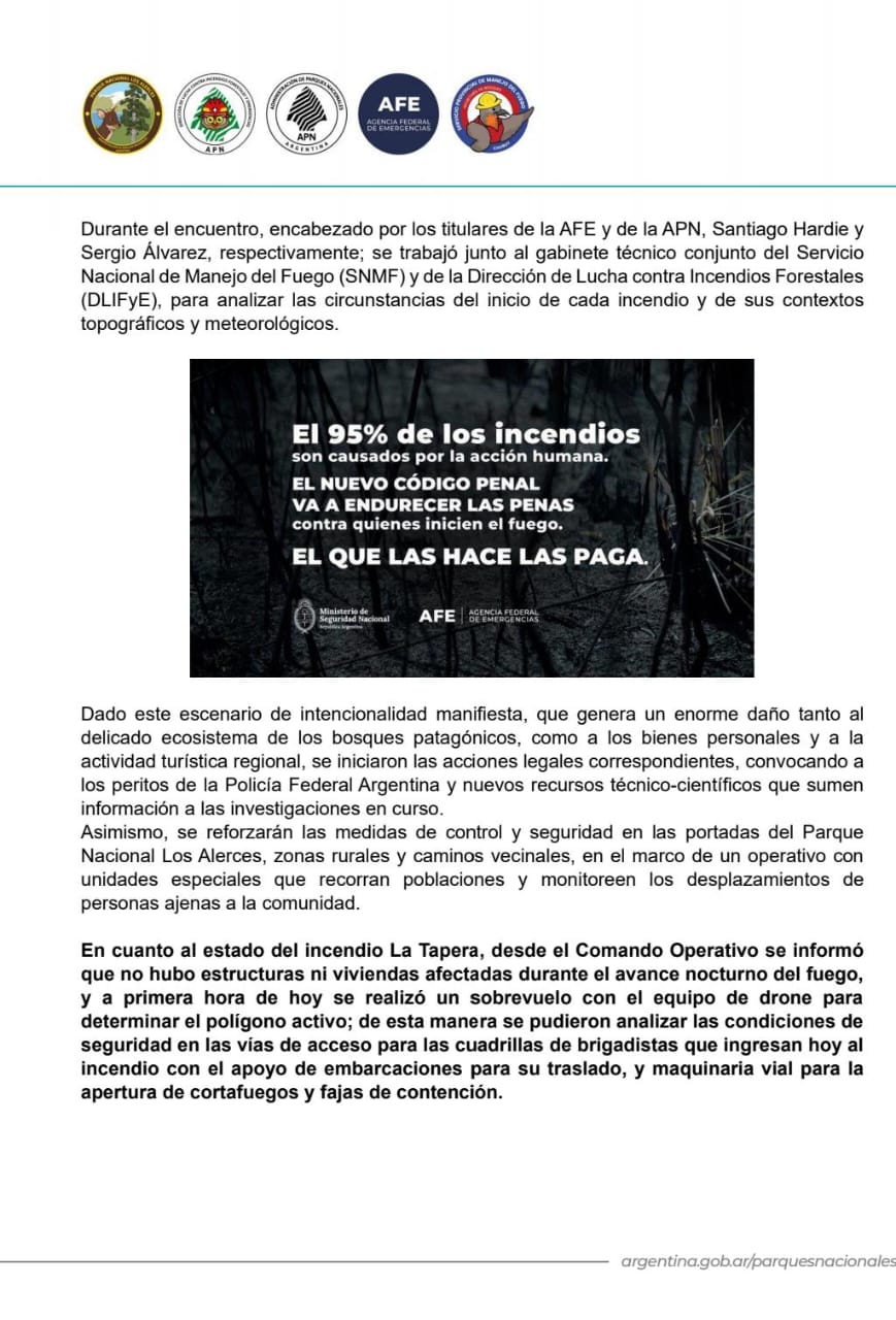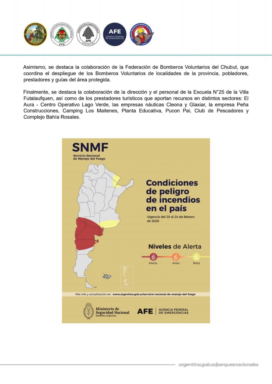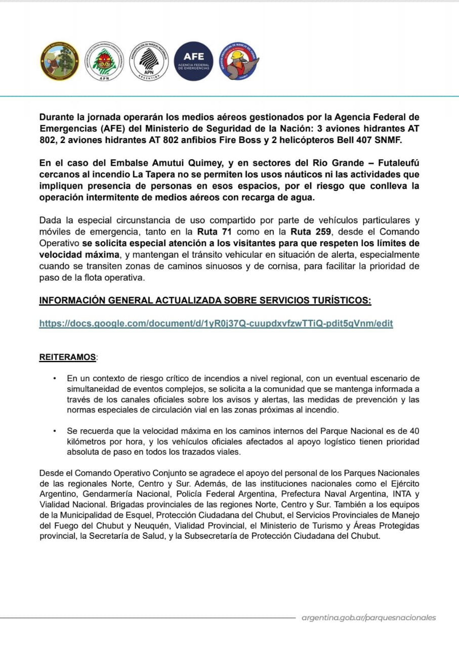 Operan los medios aéreos gestionados por la Agencia Federal de Emergencias (AFE) del Ministerio de Seguridad de la Nación: 2 aviones hidrantes AT 802 + 2 aviones hidrantes AT 802 anfibios Fire Boss + 2 helicópteros Bell 412 SNMF.