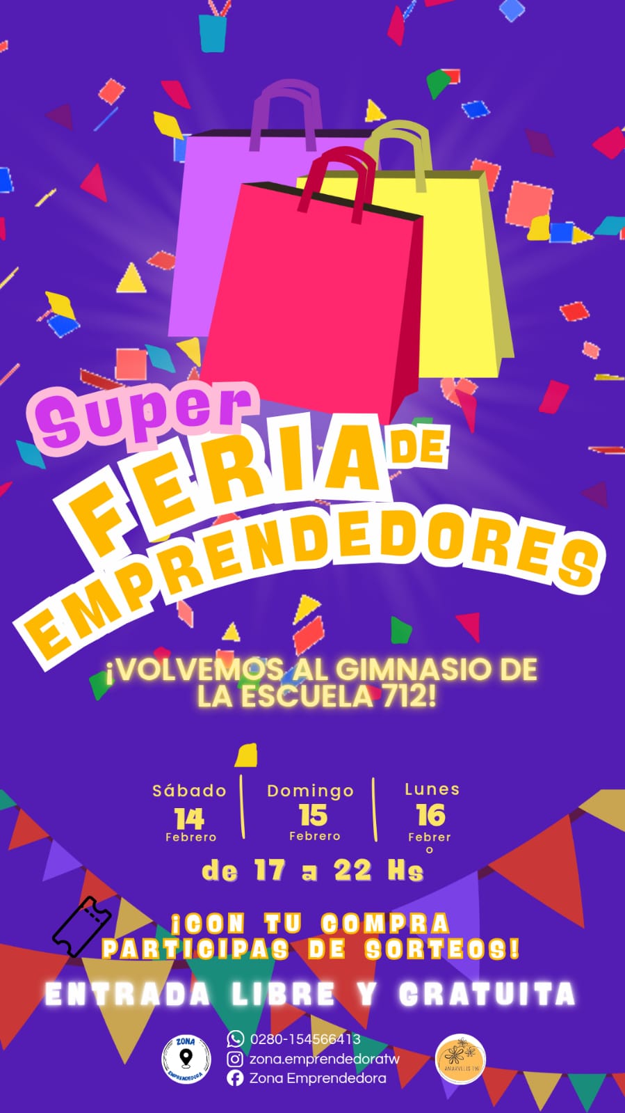 La Súper Feria de Emprendedores ya tiene nueva fecha, será el sábado 14, domingo 15 y lunes 16 de febrero, de 17:00 a 22:00 hs, en el Gimnasio de la Escuela 712, ingreso por Avenida Rawson entre Mitre y Rivadavia.
