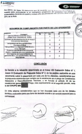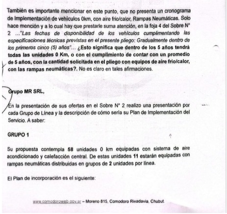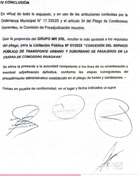 La comisión integrada por Adrián Rodriguez, sub secretario de transporte, Rita Cárdenas, sub secretaria de economía, la histórica contadora Nora Cabaleiro y Marcela Gutierrez, directora general de asesoría letrada concluyeron que «la mejor propuesta es la del grupo MR SRL ya que resulta la más ajustada a los requisitos del pliego para la licitación pública N° 01/2025 Concesión del servicio público de transporte urbano y suburbano de pasajeros en la ciudad de Comodoro Rivadavia».