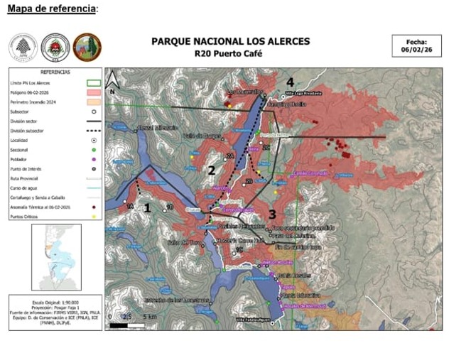 En el Parque Nacional Los Alerces, donde se registran más 15 mil hectáreas afectadas, se planificó un combate sostenido frente a los sectores que presentan actividad, mediante un trabajo conjunto entre organismos nacionales y provinciales, y con una dinámica de adaptación permanente a las condiciones meteorológicas con el fin de garantizar la seguridad del personal.
