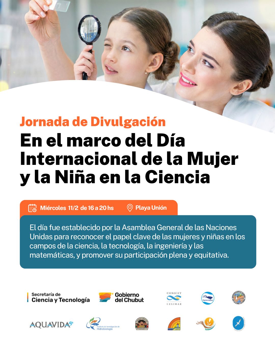 En el marco del Día Internacional de la Mujer y la Niña en la Ciencia, la Secretaría de Ciencia y Tecnología del Chubut organiza una jornada de divulgación científica este miércoles 11 de febrero, de 16 a 20 horas, en la Biblioteca Popular Asencio Abeijón de Playa Unión y el Centro de interpretación de la biodiversidad Aquavida de la villa balnearia.