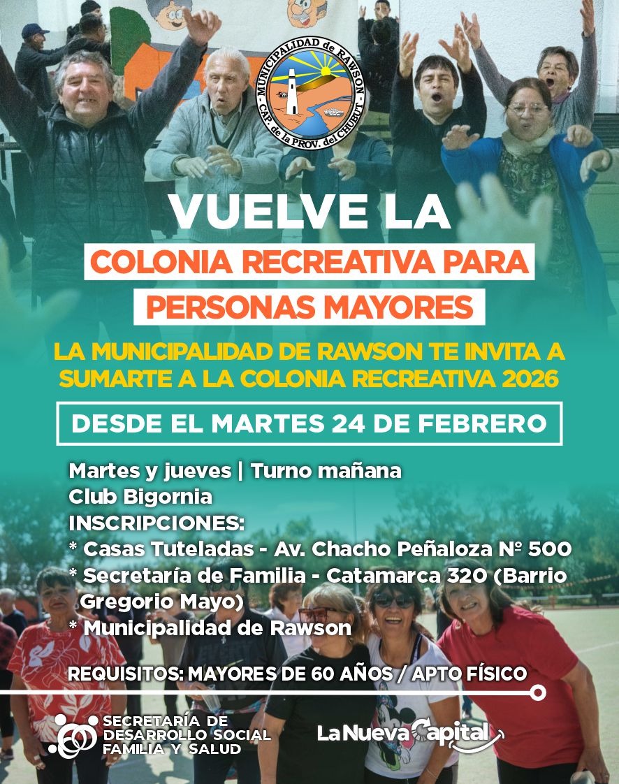 La Municipalidad de Rawson mantiene abiertas las inscripciones para la cuarta edición de la Colonia Recreativa de Personas Mayores, que se realizará en el Club Bigornia durante marzo, abril y mayo. Esta propuesta, gratuita y dirigida a adultos mayores de 60 años, brinda actividades orientadas a la recreación, la socialización y el cuidado de la actividad física.