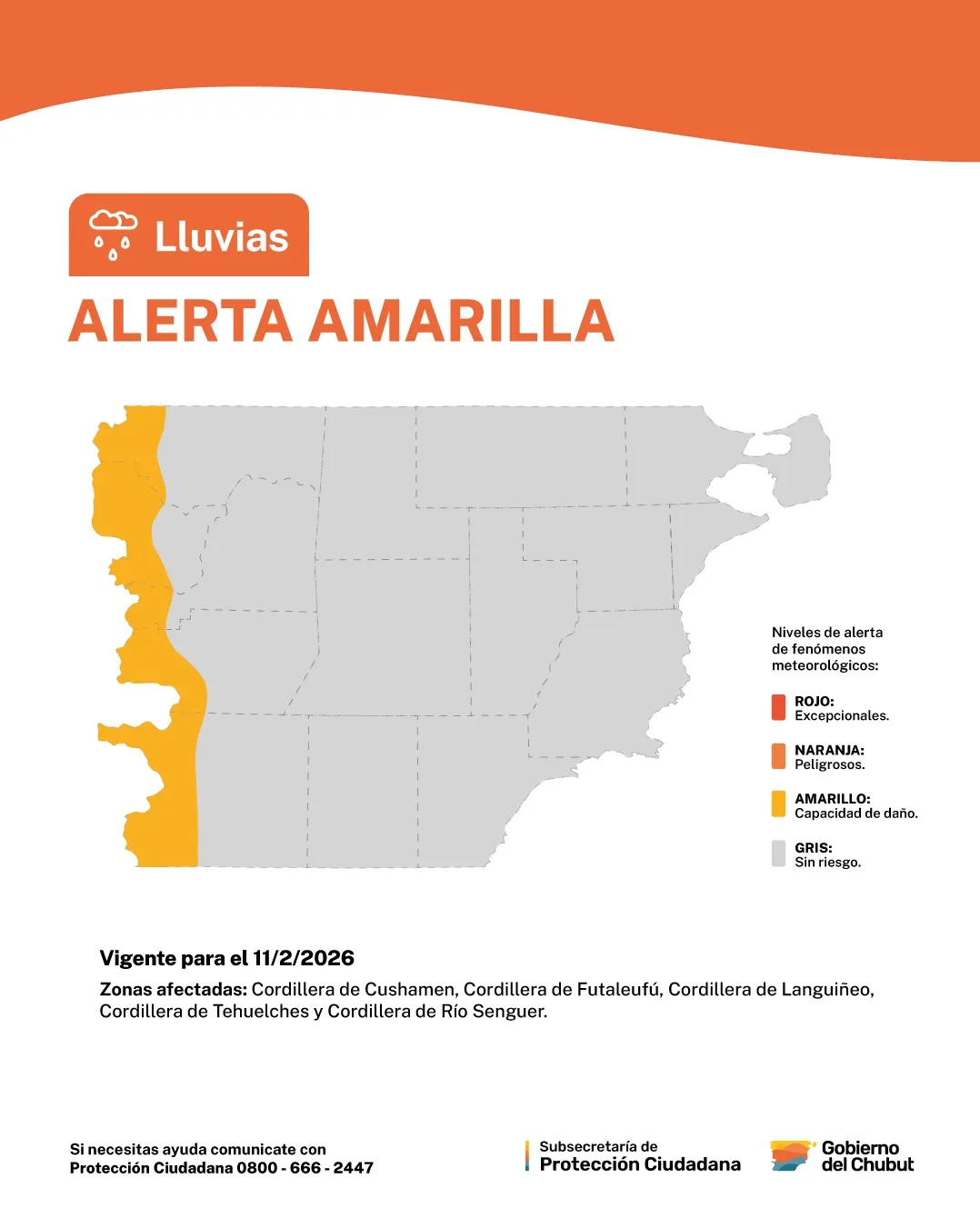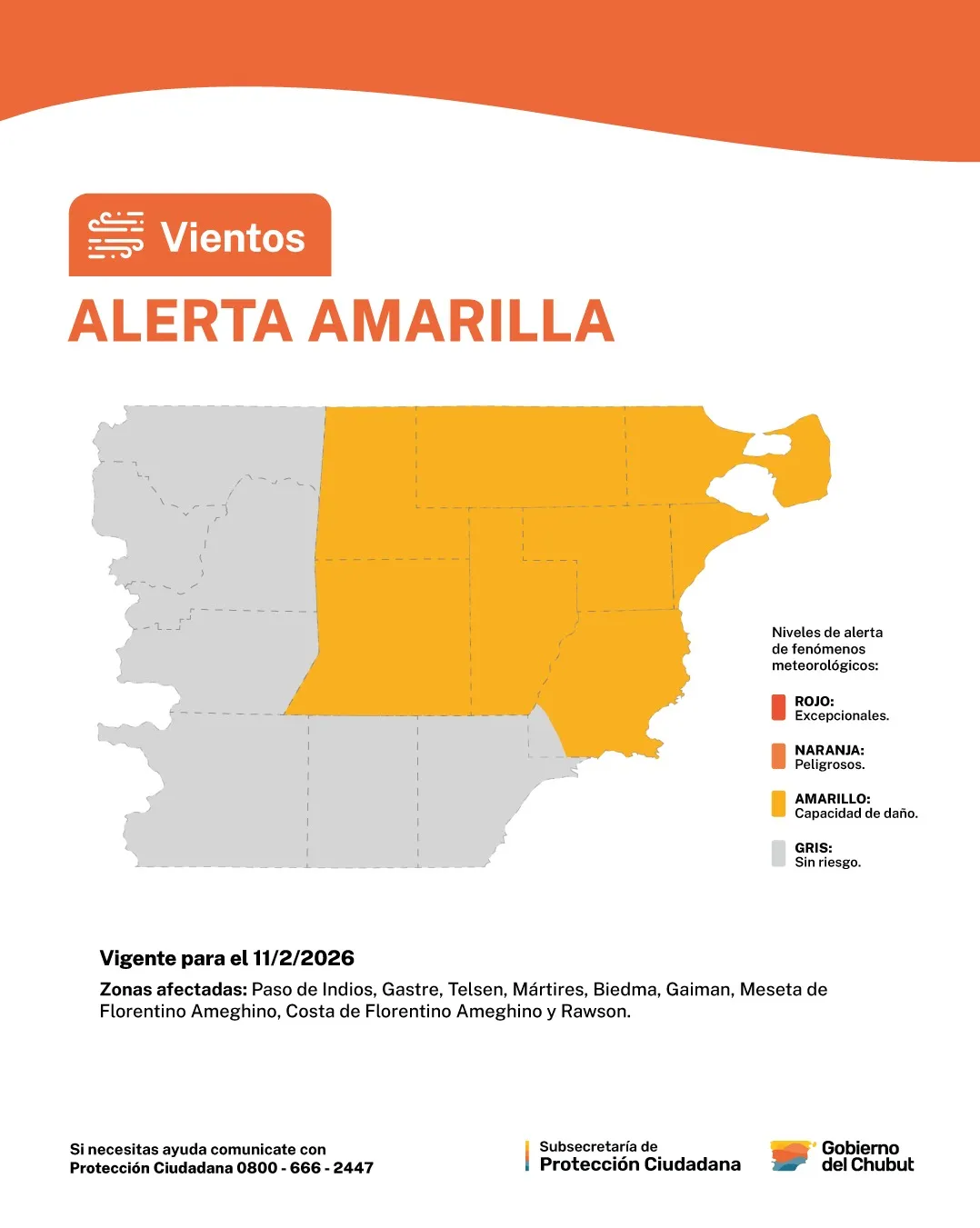Ante este panorama, la Subsecretaría de Protección Ciudadana del Chubut subrayó que el nivel amarillo indica fenómenos con capacidad de daño. Es vital recordar que cualquier emergencia debe ser reportada de inmediato a través de la línea gratuita 0800-666-2447, disponible para coordinar la asistencia necesaria en todo el territorio provincial.