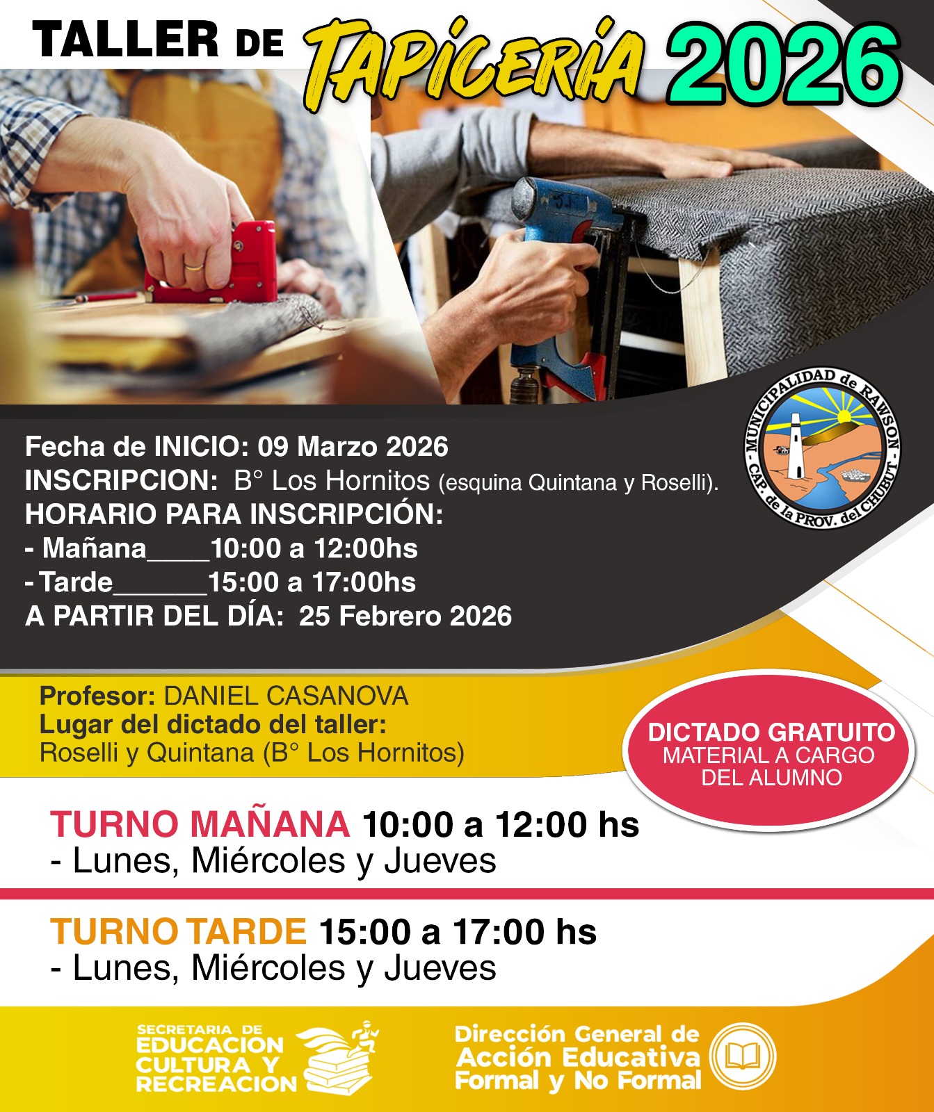 La Dirección General de Acción Educativa, Formal y No Formal de la Municipalidad de Rawson anunció que ya están abiertas las inscripciones para el Taller de Tapicería, que comenzará el 9 de marzo en turnos mañana y tarde, dando inicio al ciclo de talleres municipales 2026.