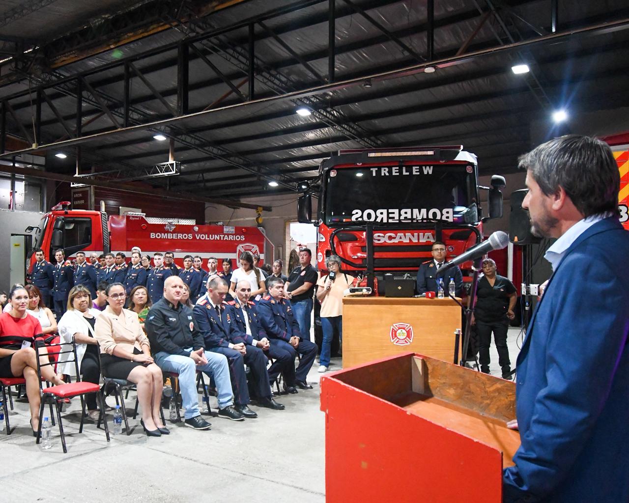 La ceremonia contó con la presencia del ministro de Gobierno de Chubut, Victoriano Eraso Parodi; el presidente de la Federación Chubutense de Asociaciones de Bomberos Voluntarios, Rubén Oliva; la presidenta de la Asociación de Bomberos Voluntarios de Trelew, Lucía Gutiérrez; la directora provincial de Bomberos, Silvana Díaz; concejales de la ciudad; autoridades municipales; el jefe del Cuerpo Activo, comandante mayor Cristian Otero; el subjefe, oficial principal Hernán Montes de Oca; integrantes del cuerpo activo, personal administrativo, ex miembros de comisiones directivas, invitados especiales y vecinos.