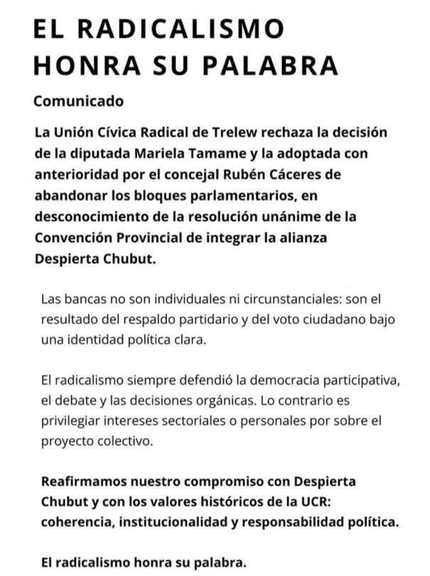 A través de un duro comunicado titulado «El Radicalismo honra su palabra», la conducción de la UCR de Trelew cuestionó la ruptura de la alianza «Despierta Chubut». El escenario profundiza la grieta partidaria tras el apoyo recibido por la diputada en la capital provincial.