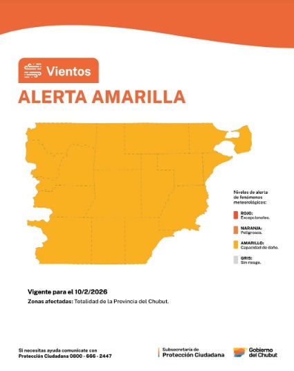 Chubut se encuentra bajo alerta amarilla por vientos para este martes 10 de febrero, según la actualización emitida por el Servicio Meteorológico Nacional. La advertencia alcanza a la totalidad del territorio provincial y prevé intensas ráfagas en distintas franjas horarias según la región.