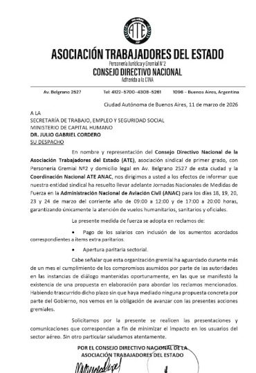 La Asociación de Trabajadores del Estado (ATE) confirmó un plan de lucha que afectará la operatividad de los principales aeropuertos de Argentina a partir del próximo lunes 18 de marzo.