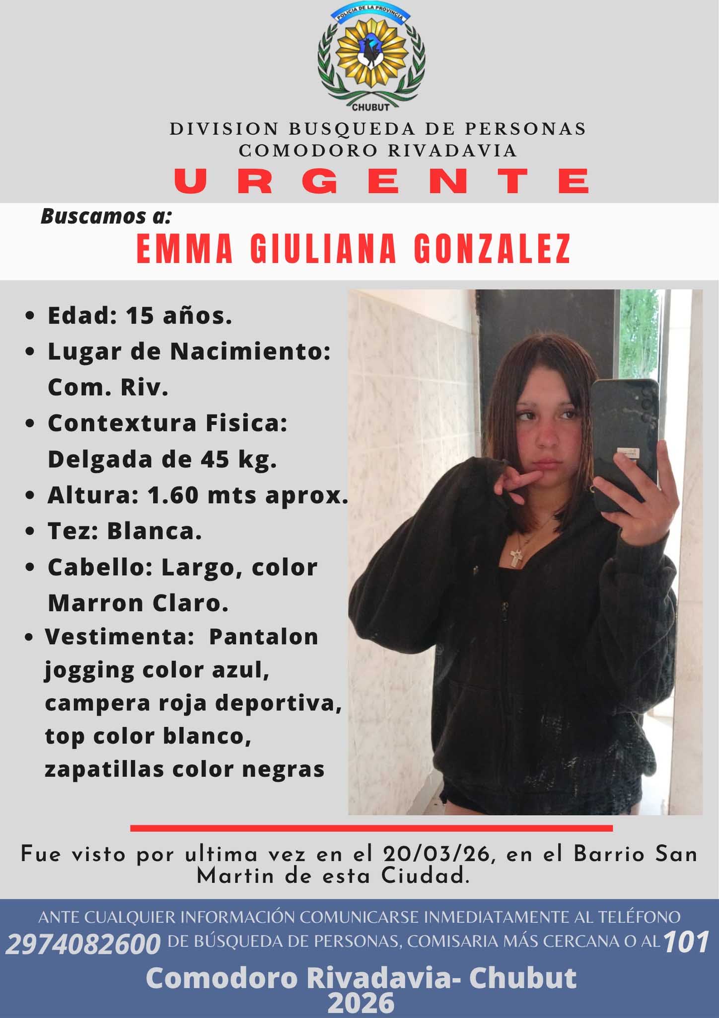La División Búsqueda de Personas de la ciudad de Comodoro Rivadavia emitió este sábado un pedido de colaboración urgente para localizar a Emma Giuliana González, una adolescente de 15 años que fue vista por última vez el viernes 20 de marzo. La familia de la menor y las autoridades se encuentran en estado de alerta y solicitan la ayuda de la comunidad para dar con su paradero.