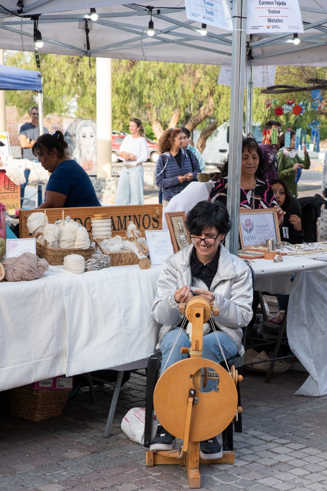 La feria estuvo acompañada por food trucks, una carpa de emprendedores con el sello Origen Chubut, presencia de artesanas del programa Tejiendo Futuro, emprendedores de Rawson y espacios institucionales vinculados al sector lanero. También se instaló un stand de la Municipalidad de Epuyén, donde se brindó información sobre la próxima sede del encuentro.