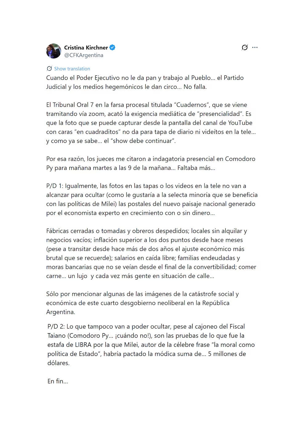 La exjefa de Estado deberá presentarse este martes a las 9 de la mañana en una audiencia que será transmitida en vivo. Según Infobae, Kirchner sostuvo que el requerimiento de presencialidad responde a una «exigencia mediática» para obtener una fotografía que alimente a los medios de comunicación, dado que el trámite venía realizándose vía Zoom. En su mensaje, fue tajante al afirmar: “Cuando el Poder Ejecutivo no le da pan y trabajo al Pueblo… el Partido Judicial y los medios hegemónicos le dan circo… No falla”.