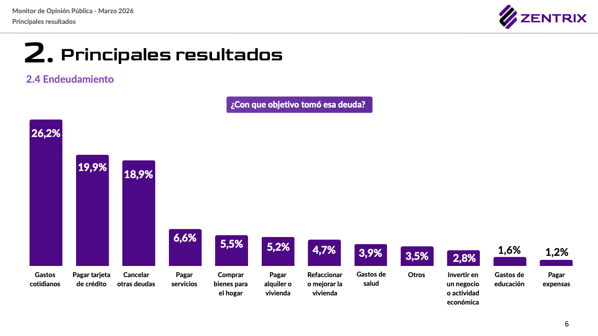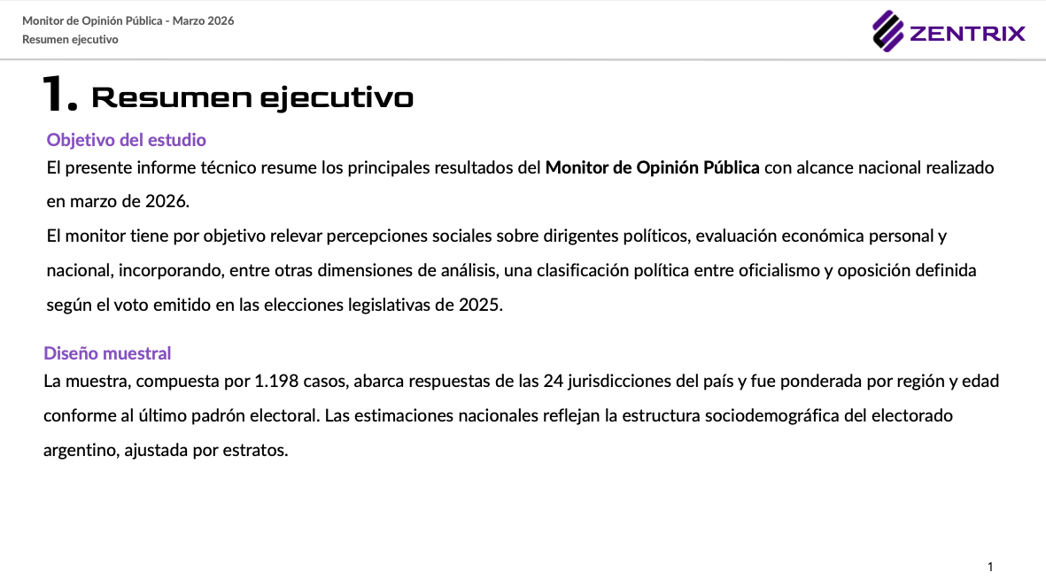 Ficha técnica: Encuesta autoadministrada online realizada por Zentrix del 10 al 19 de marzo de 2026. 1.198 casos nacionales. Margen de error: +/- 2,83%.