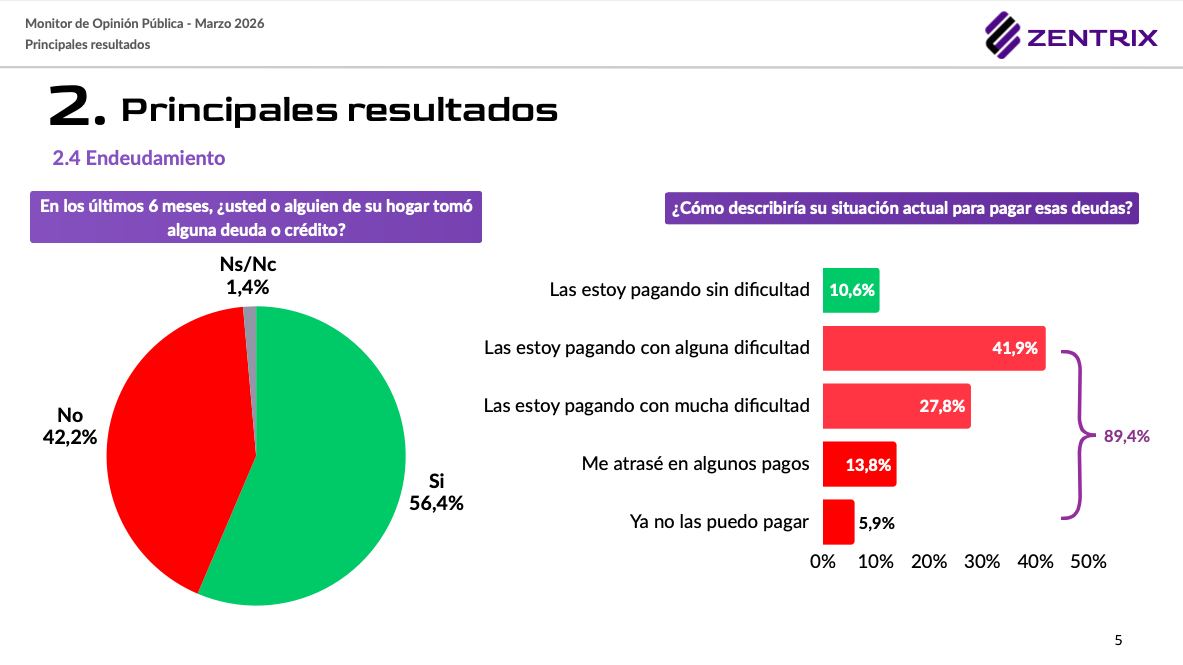 Endeudamiento como «salvavidas»: El 56,4% de los hogares tomó deuda en los últimos seis meses, pero no para inversiones, sino para cubrir gastos corrientes y servicios. De este grupo, casi 9 de cada 10 enfrentan dificultades para cumplir con los pagos.