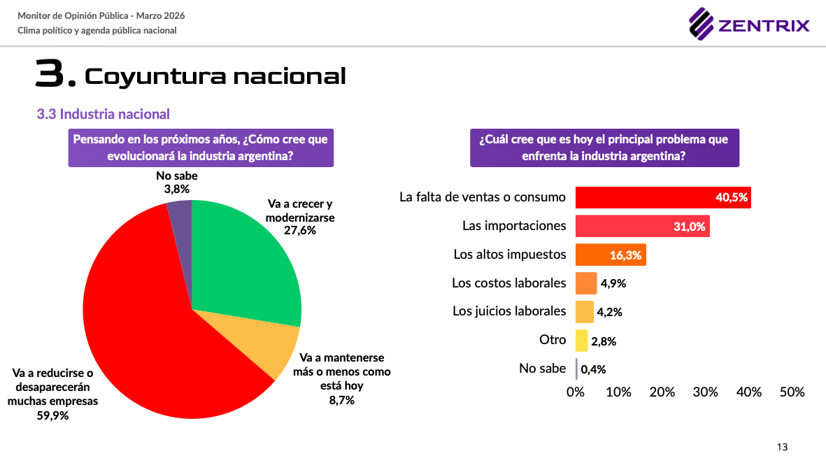 Uno de los puntos más críticos del monitor es la visión sobre el futuro productivo. El 59,9% de los argentinos cree que la industria nacional va a reducirse o que muchas empresas desaparecerán en los próximos años.