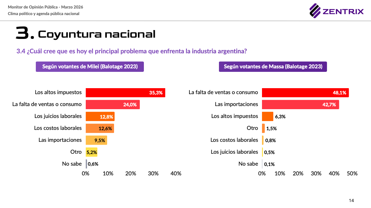 Existe una brecha clara en el diagnóstico según la afinidad política: mientras los votantes de Milei atribuyen los problemas industriales a la alta carga impositiva (35,3%), los sectores opositores señalan como causas principales la caída del consumo (48,1%) y el impacto de las importaciones (42,7%).