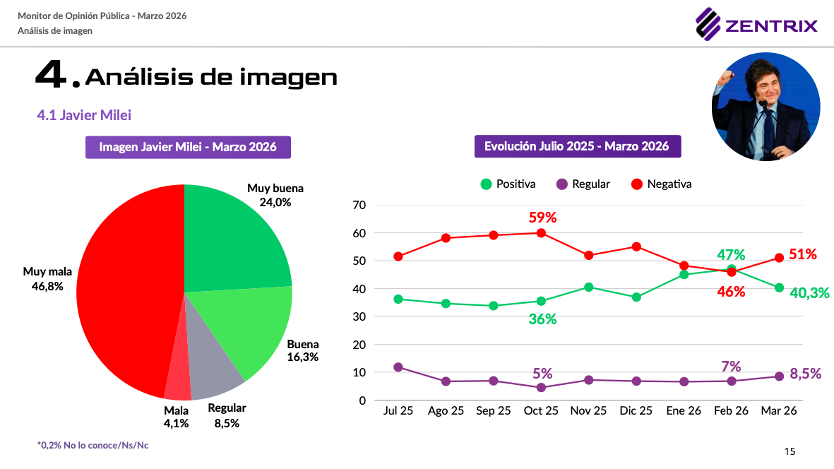 El escenario político y social de marzo de 2026 presenta desafíos crecientes para la administración de Javier Milei. Según el último relevamiento nacional de la consultora Zentrix, la desaprobación de la gestión presidencial dio un salto de 8,3 puntos respecto a la medición anterior, situándose en un 53,3%. Por el contrario, la aprobación se ubica en un 38,5%, consolidando una mayoría crítica que refleja el impacto del ajuste en la vida cotidiana.