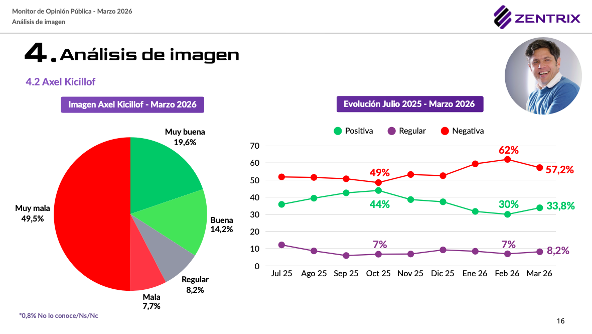 En cuanto a la imagen personal, Javier Milei registra un 50,9% de imagen negativa frente a un 40,3% de positiva. En la oposición, figuras como Axel Kicillof y Juan Grabois mantienen niveles de negatividad elevados, con un 57,2% y 57% respectivamente, lo que marca un clima de descontento generalizado con la dirigencia.