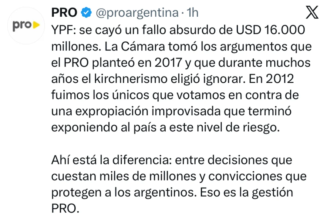Desde el PRO recordaron que fueron el único bloque que se opuso a la estatización de la petrolera en 2012, advirtiendo sobre las posibles consecuencias legales internacionales. “Se cayó un fallo absurdo de USD 16.000 millones. La Cámara tomó los argumentos que el PRO planteó en 2017 y que durante muchos años el kirchnerismo eligió ignorar”, expresaron desde el partido.