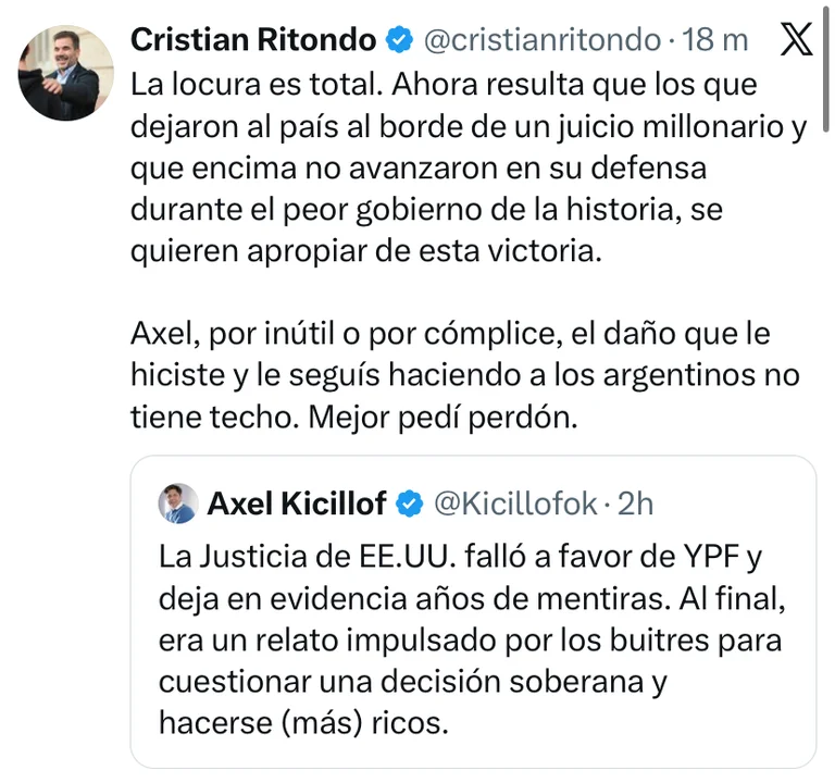“La locura es total. Resulta que los que dejaron al país al borde de un juicio millonario y que encima no avanzaron en su defensa durante el peor gobierno de la historia, se quieren apropiar de esta victoria”, disparó Ritondo. Con estas declaraciones, el diputado se alineó con la postura del Ejecutivo nacional, señalando la responsabilidad política de quienes lideraron el proceso de estatización en 2012 y la posterior estrategia legal en los tribunales de Nueva York.